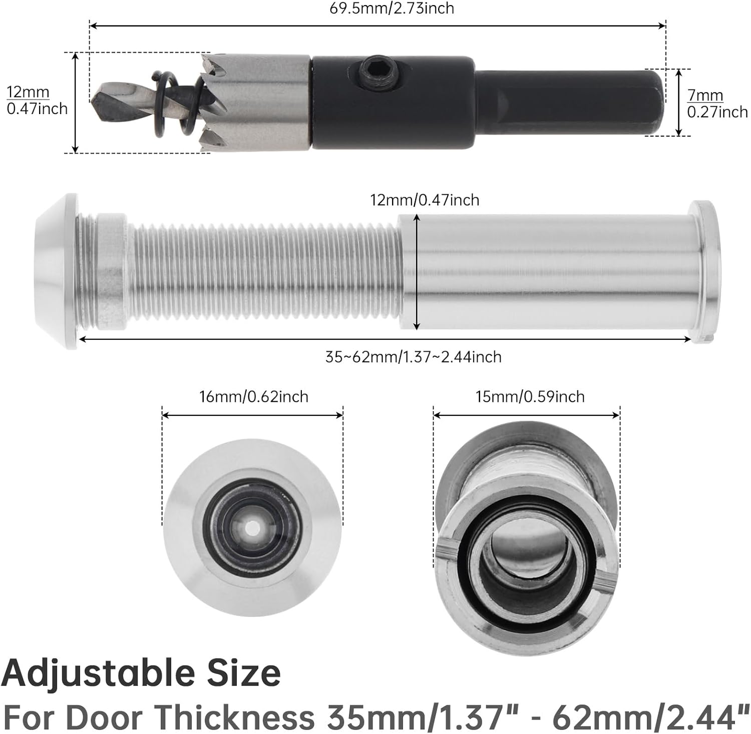 Parameter Information: Color: Black,Bronze,Gold,Brushed Nickel,White Material: Optical Glasses Lens,Brass Pipe Diameter: 12MM / 0.47Inches Suitable Door Thickness: 35-59 mm Doors Thickness Visual Angle: 160 Degree Features: - Wide Compatibility: Fits door thicknesses from 1-3/8" to 2-5/16" thick(35-59mm) and holes 1/2"-9/16" (12-14 mm) in diameter. - Crystal-Clear Vision: High-definition lens provides a 160° wide-angle view for enhanced safety and monitoring. - Sturdy & Stylish: Made of solid brass robust with a modern design that blends with existing door hardware. - Easy Installation: Requires only a single drill hole (12 mm diameter). Includes internal and external components that screw together snugly, with flanges covering drilling imperfections. - Compact Dimensions: Viewer diameter: 1.2 cm (0.5″); Mounting plate: 1.6x1.6 cm (0.63x0.63 inches). - Wide Use: Modern security door viewer suitable for home, office, hotel, and front doors. It is a must safety complement anywhere you need to view who is outside your door before opening. Note: Measure your door thickness and drill a straight hole (12-14 mm). Insert the viewer and tighten both sides for a secure fit. Package Include: 1 x 12 mm Door Viewer 1 x Drill Bit