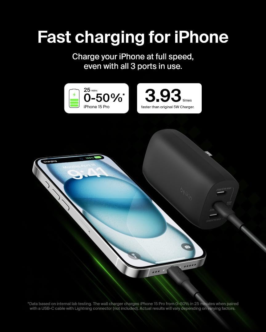 Whether you're at home or on the go, keep your devices charged with the Belkin 140W PPS USB-C Wall Charger. This 30-watt charger is equipped with PPS technology, which allows for optimized charging with compatible devices by dynamically negotiating the best charging voltage. It’s packed with the latest USB-C Power Delivery 3.1 and PPS technologies, working together to safely deliver the ideal amount of fast power to the device it’s connected to. And with interchangeable plug tips, you can charge your MacBook Pro, iPhone, Galaxy, and more in various outlets. Includes: One Belkin 140W GaN Wall Charger and a 2-year warranty. Belkin is an established accessories market leader creating high-quality, innovative tech solutions for 40 years. Specifications: Compatibility: Apple iPhone 17, iPhone Air, iPhone 17 Pro, iPhone 17 Pro Max, iPhone 16, iPhone 16 Plus, iPhone 16 Pro, iPhone 16 Pro Max, iPhone 15, iPhone 15 Plus, iPhone 15 Pro, iPhone 15 Pro Max, iPhone 16, 15, 14, HTC U12+, Galaxy S25+, Galaxy S25, Galaxy S24, S24+, S24 Ultra, Galaxy S23, S23 FE, S23+, S23 Ultra, S22, S22+, S22 Ultra, Google Pixel, iPad Pro (12.9") 2nd Gen, iPad Pro (10.5"), Huawei Mate 20, Huawei Mate 20 Pro, Huawei P30/P30 Pro, Sony Xperia XZ2, and more 2-year limited warranty.