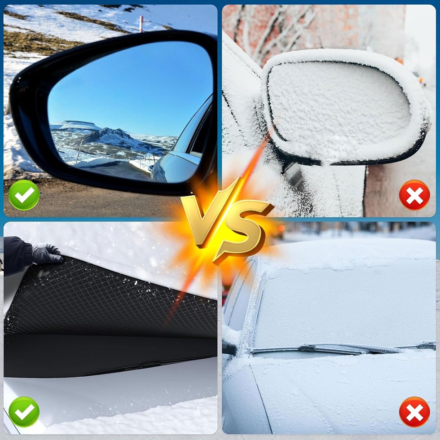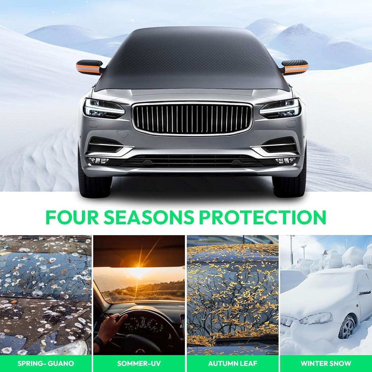 【SPECIFICATION】- Name: Car Windshield Snow Cover- Material: Oxford cloth- Package Contents: 1 x Front Window Cover【FEATURES】1. Applicable for a long time, spring wind and sand bugs, summer sun and rain protection, autumn frost and ice dew, winter rain and snow!2. When parking, fully cover the windshield of the car's front,effectively protect the windshield from damage.3. Comes with high elasticity windproof belt, strong windproof ability, wrapping edges do not hurt the paint, prevent scraping and flying, higher adhesion.【HOW TO INSTALL】1. Spread the windshield snow cover on your car windscreen.2. Keep the magnetic edges securely covering your car's wiper and roof areas.3. Secure the rope to the front and rear wheels.4. Put two mirror covers on the rearview mirror.【NOTE】- Please allow 1-2cm measuring deviation due to manual measurement.- Due to the different monitor and light effect, the actual color of the item may be slightly different from the color shown on the pictures. Please understand, thank you!【SERVICE】We strive to provide customers with the highest quality products and the best after-sales service. Products have passed strict quality control. If you have any questions, you can contact us in time, we will reply you within 24 hours and provide you with a satisfactory solution.